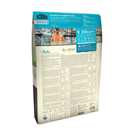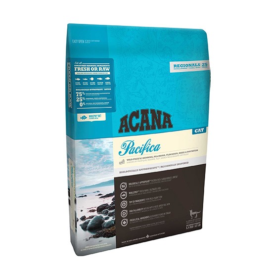 אקאנה רג’ינל לחתול פסיפיקה דגים עשוי בין היתר מפירות וירקות טריים ומ-5 סוגים שונים של דגים -הרינג, סרדינים, דל סנדל, בקלה וורדון אשר מגיעים למפעל שלמים וטריים בכדי לספק לחתול את כל צרכיו כטורף וכציד בטבע.
