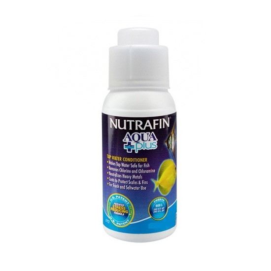 אקווה פלוס תוצרת נוטרפין מבית האגן קנדה, מרכך מים נוזלי, להסרת כלור וכלורמין ולנטרול מתכות כבדות ורעלים לדגים המצויים במי הברז.