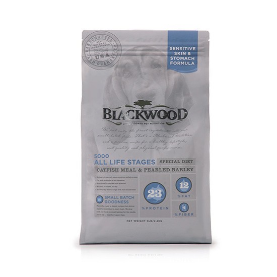 בלקווד 5000 – מזון היפואלרגני הוליסטי. על בסיס דג שפמנון וגריסי פנינה. ייוצר עבור כלבים אשר דורשים תחליף תזונה בשל רגישות למזון. חב’ בלקווד פיתחה נוסחה מיוחדת שאין בה תירס, חיטה וסויה. הפרוטאין של דג השפמנון עוזר לנו לשמור על תזונה מאוזנת ומושלמת של הכלב, תוך כדי הימנעות מאלרגניים שכיחים (חלבון מן החי ודגנים). המזון מיוצר בתהליך בישול ייחודי. הבישול האיטי, הארוך ובטמפ’ נמוכה מבטיח נעכלות גבוהה של למעלה מ-92%. ייחודיות המזון בייעודו לליווי הגור בכל שלבי גדילתו ולאורך כל חייו הבוגרים. טעימות גבוהה במיוחד.