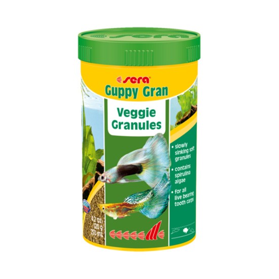 מזון לדגים סרה גופי גראן, מזון צמחי בצורת גרגירים בצבע ירוק המיועד לדגי גופי במיוחד ולדגי נוי קטנים אחרים.