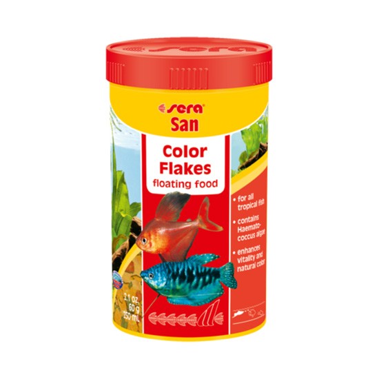 מזון לדגי נוי. סרה סאן מחזק צבע, מזון בצורת דפים מגוונים, המיועד לדגי נוי אשר חיים באקווריום.