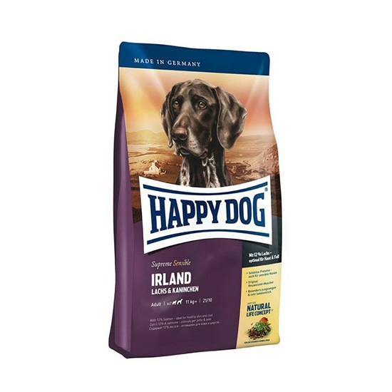 הפי דוג אירלנד הינו מזון סופר פרימיום ייחודי עבור אניני הטעם שמחפשים מזון מיוחד, בעלי רגישויות למזון וגם עבור כלבים בררנים. הפי דוג אירלנד משלב סלמון מעודן וארנב טעים. מרכיבים שנבחרו בקפידה (שאינם כוללים חלבון מטלה או מעוף, ללא אורז, סויה או חיטה), שיטות ייצור מיוחדות לקבלת חלבון ואנרגיה איכותיים המתאימים גם לכלבים בעלי רגישויות. כופתיות בגודל מותאם לשיניים של כלבים בינוניים וגדולים, טעים ובעל נעכלות גבוהה להשלמת המתכון, נוסחה ייחודית של הפי-דוג לייף-פלוס ®, המכילה חומרים טבעיים ועתירי אנרגיה.