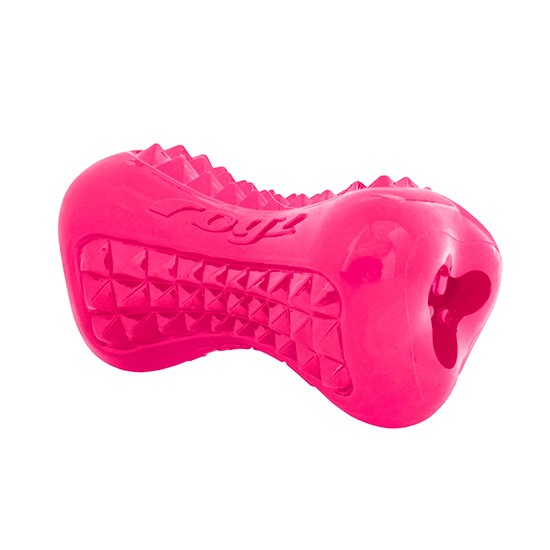 צעצוע לכלב רוגז עצם לעיסה דנטלית עם חורים, עשויה מגומי רך יחסית אך חזק.
