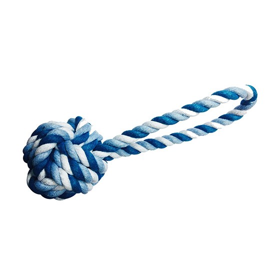 צעצוע כדור חבל עם לולאה דנטלי לכלב, טוב לניקוי השיניים- כאשר הכלב נועץ את שיניו בצעצוע בין סיבי החבל, הלכלוך שעל השן יורד כתוצאה מהחיכוך שנובע משחיקת השן עם החבל.