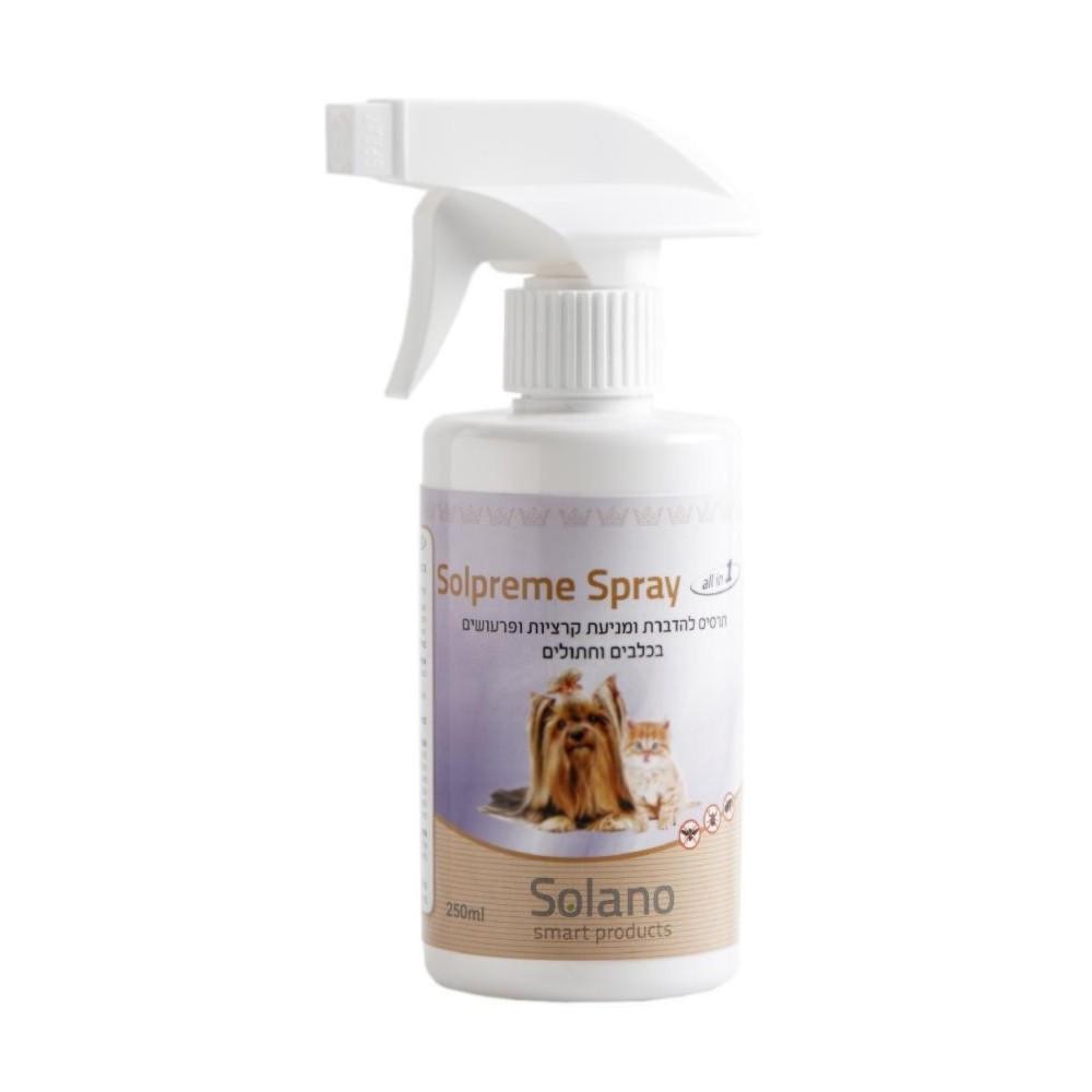 תרסיס סולאנו סולפרם תכשיר להדברה ומניעה של פרעושים וקרציות בכלבים ובחתולים בכל הגדלים תוצרת סולאנו / solano ישראל.