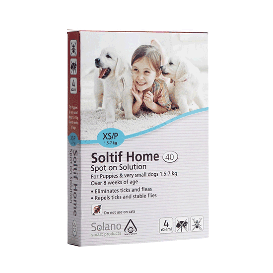 סולטיף הום תכשיר להדברה ומניעה של פרעושים וקרציות בכלבים. מותאם במיוחד לכלבים החיים בבית בסביבה משפחתית, תוצרת סולאנו / solano ישראל.