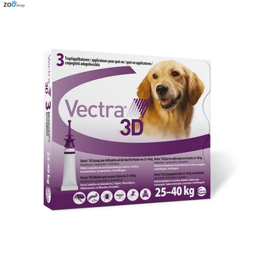 מארז 3 אמפולות וקטרה 3d לקטילה ולמניעה של פרעושים וקרציות לכלב גדול ששוקל 25-40 ק”ג.